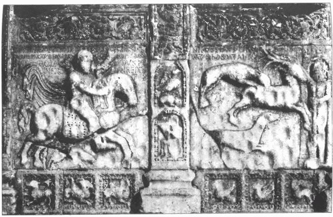 Рис. 75. Теодорих, преследующий оленя (рельеф на главном портале церкви св. Зинона в Вероне)