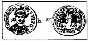Рис. 24. Эицимер с императором Антемием (на реверсе золотого солида Антемия)