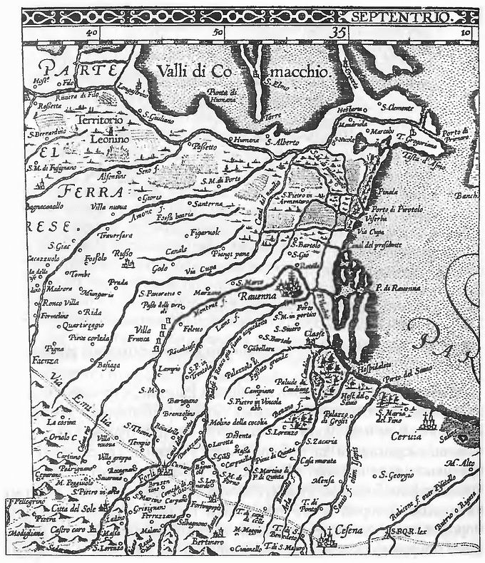 В течение столетий альпийские и апеннинские реки несли сюда неимоверное количество гальки и песка, в результате чего образовалось большое болото, ставшее рассадником малярии. Там, где теперь возвышается церковь Санта Мария ин Порто-фьори (примерно в 3,5 км юго-восточнее Равенны) была торговая гавань; неподалеку от церкви Сан Аполлинаре ин Классе была военная гавань (примерно в 5 км юго-восточнее Равенны). Море затопило эти места еще во времена Данте. Но эти гавани потеряли свое значение гораздо раньше; возможно, после того, как г. Классе в 751 году разрушил Айстульф. Теперь бывший торговый порт отделяет от моря расстояние, которое можно пройти примерно за час. Сама Равенна находится на расстоянии примерно 10 км от Адриатического моря, с которым ее в 1737 году соединил канал Корсини. Веррука (ныне – Дос Тренто) сохранившаяся до наших дней крепость на вершине горы напротив Триента.