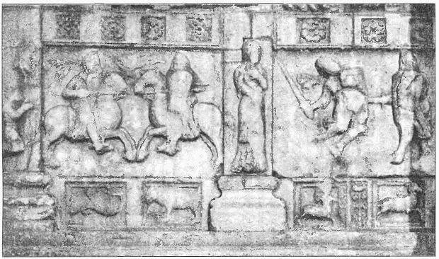 Рис. 29. Бой Теодориха с Одоакром и гибель Одоакра (рельефы на левой стороне главного портала церкви св. Зинона в Вероне)