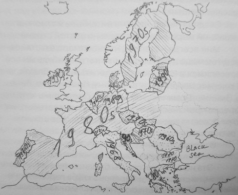 Нельзя было пренебрегать и девяностыми, которые в большинстве стран стали второй политической силой и, в некотором смысле, мечтой и светлым будущим империи восьмидесятых. Сюда входили Чехия, Литва, Латвия и Эстония, все еще опьяненные обретением независимости после 1989 года. В итоге Словения и Хорватия также избрали последнее десятилетие XX века с особой оговоркой: они включатся в него после Югославской войны. Этот выбор устраивал и либералов, и националистически настроенных: каждый из них видел перспективы развития. Этому раздробленному и неспокойному государству девяностых мог подставить плечо (или лапу) и ирландский тигр. Ожидалось также прибытие новых эмигрантов из других стран. Империи семидесятых и восьмидесятых рано или поздно должны были пристать именно к этому берегу.