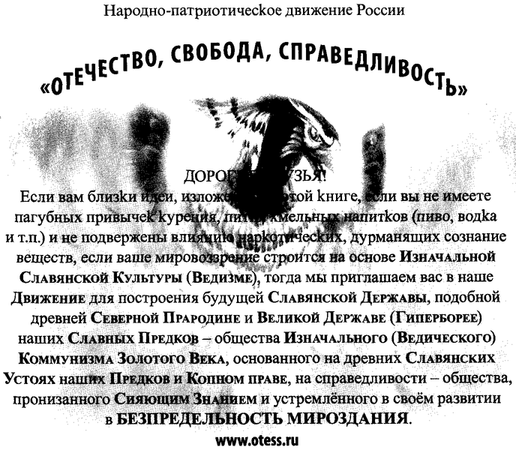 Если содержание книги не оставило Вас равнодушным, если после прочтения её Вы задаётесь вопросами: «Что же делать?», «Как я могу быть полезен в той борьбе, которая ведётся сегодня национал-патриота– ми за будущее России?», то Вы имеете реальную возможность принять участие в сражении за будущее нашей Родины. Вставайте в ряды Политической Партии «Порядок», возглавляемой лидером Движения «Сопротивление»Романом Павловичем Зенцовым, или Общественного Совета Гражданского общества , структуры которого всецело поддерживают инициативу создания данной политической силы, и вместе мы наведём Порядок на нашей земле!