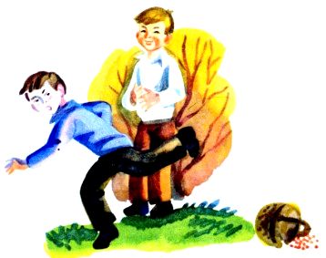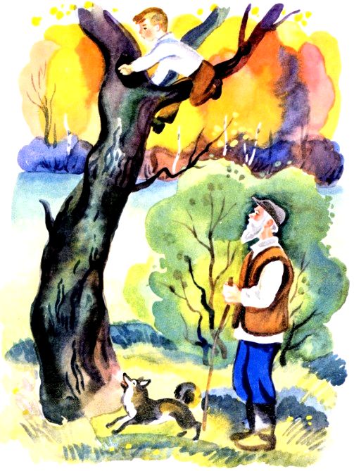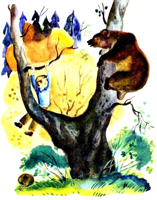 Медведь первым добрался до верхушки, только ветка, видать, не выдержала и надломилась. Рухнул косолапый прямо на Микуську. Я и ахнуть не успел, как они оба с шумом и треском покатились кубарем к моим ногам. Медведь с рычаньем бросился наутёк, а Микуська с визгом понёсся в другую сторону.