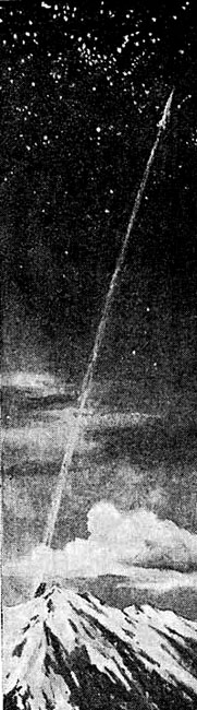 Где космический корабль? На горе или уже над горой? Высоко-высоко над снежной вершиной мелькает светящееся пятнышко. Да, это ракета. За ней тянется хвост из белых хлопьев… Над Казбеком растет пушистый столб с заостренной вершиной, он становится все выше и тоньше. На самом верху ею невидимая стальная иголка вонзается в небо.