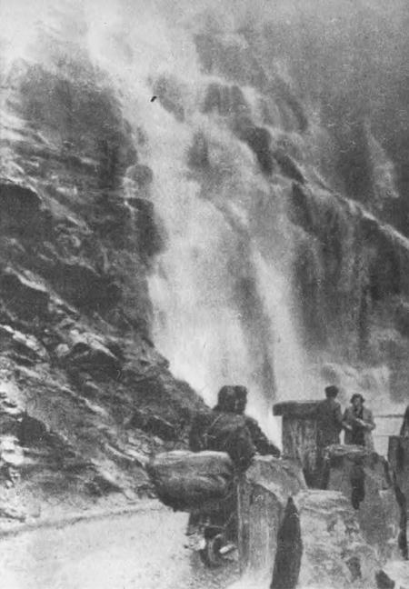 Едем дальше. Вода то льется по бурым кручам сотнями серебряных нитей – совсем как расплавленное серебро, – то срывается с утесов в бездну. В одном месте поток перехвачен для турбин гидростанции и пущен по трубам. В другом над взбесившейся водой раскачивается висячий мостик с продырявленными боковыми сетками.