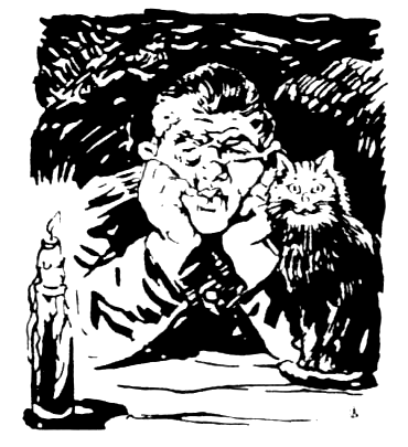 Все так же чернели в комнате тени, все так же переливались фосфором глаза кошек. Положив голову на стол, недвижно сидел человек со страшным лицом. Беззвучно шевелились его губы, в мутных глазах прыгал красноватый отсвет. Хищные птицы в углах потолка стерегли покой своего хозяина.