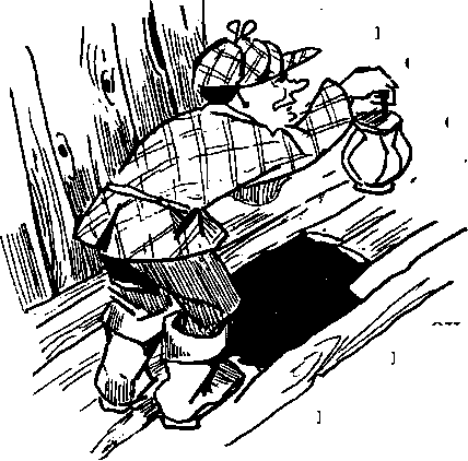 Сыщик ходил по клетке и не мог найти улик, показывающих на преступников. Неожиданно он наступил на одну доску пола. Один конец ее поднялся вверх и ударил его в лоб. И тут же он увидел главную улику. Под доской был прорыт подземный ход и рядом лежал острый коготь. Вырытый ход уходил глубоко под землю.
