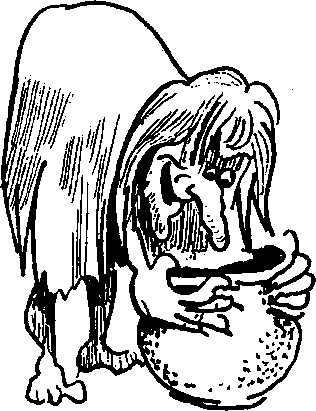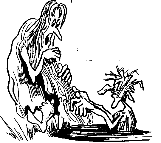Идет баба с базара большаком с глиняным горшком. Болотник выскочил, глаза выпучил, страшную рожу показал, зубами застучал, ногами затопал, руками захлопал. Баба испугалась, закричала.