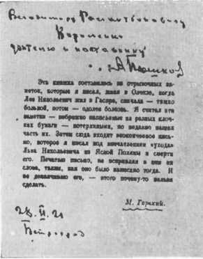 Первая страница книги А. М. Горького «Воспоминания о Льве Николаевиче Толстом» с дарственной надписью.