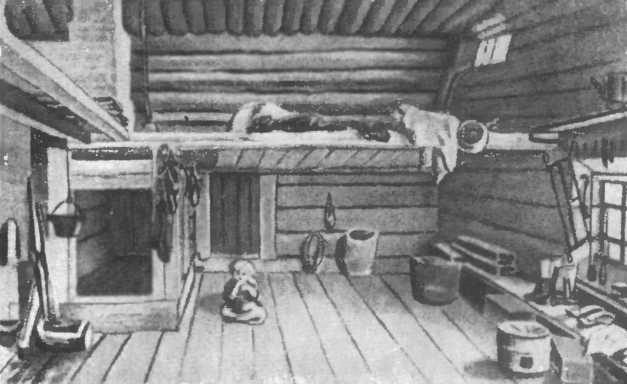 Внутренность избы в Березовских Починках, где жил В. Г. Короленко, Рисунок В. Г. Короленко 1880 года.
