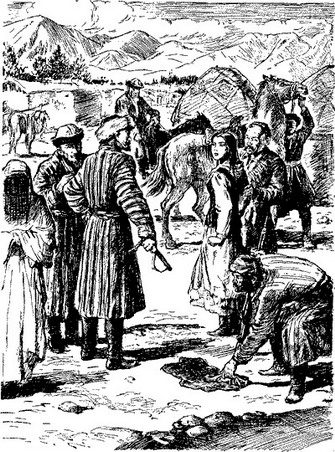 Зейнеб оглянулась назад, увидела родные снежные горы, и на глаза у неё навернулись слезы. Неприязнь к Тагаю вырастала в ненависть. Сквозь слезы Зейнеб смотрела на окружающее. По дороге шли невиданные звери, огромные, лохматые, с кривой шеей. Вот прошло стадо рогатых животных, похожих на яков, но без волосатых хвостов и горбов.