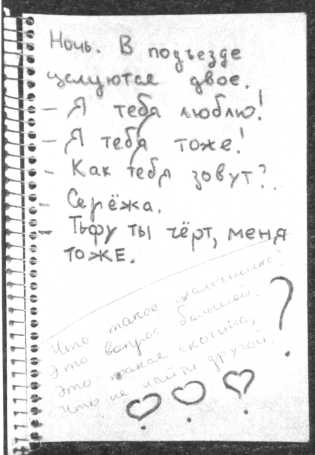 В «песенники» помещаются и различные шуточные тесты. Например: «назовите пять героев сказок. 1 – такой ты дома, 2 – в школе, 3 – в гостях, 4 – с родными, 5 – на самом деле». Или: «назовите 4 строчки из четырех разных песен. 1 – такой(-ая) ты до свадьбы, 2 – во время свадьбы, 3 – после свадьбы, 4 – всю жизнь». Или: «Назовите 3 любимых животных и объясните, за что вы их любите». После того, как их назовут: «Такой вы дома, на работе, в постели». Некоторые тесты заимствуются у взрослых, как, например, тест «рисунки». В нем предлагается нарисовать свой абстрактный портрет из кружков, квадратов, треугольников. Квадрат означает отзывчивость, круг – доброту, треугольник – сексуальность. Портрет рисуется в рамке 3 на 3 сантиметра, элементы подсчитываются, и объявляется результат – сколько чего в процентах.