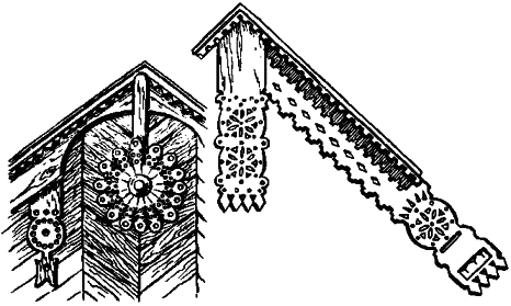 Больше всего скульптурной резьбой декорировались двускатные крыши. Концу охлупня придавались очертания конской головы, оленя с ветвистыми рогами, гуся, лебедя. Потоки (водопуски) часто заканчивались изображениями с резными перехватами. Концам куриц придавались формы птичьей и конской головы, змеи с разинутой пастью или какого-то фантастического чудовища со стоячими ушами, рогами. На повалах, помочах, пропусках вырезались пластические завитки, цилиндры, пояски и дата постройки дома. Эта традиция ведет начало от языческих времен, когда над домами изображались духи – обереги[102]102