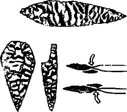 Кремневые орудия труда эпохи неолита. Слева – схема двустороннего отжима чешуек с кремневой заготовки, справа и внизу – наконечник и ножи, изготовленные путем двустороннего отжима кремневой заготовки.