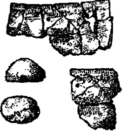 Керамика. Вверху и справа – обломки керамического сосуда эпохи неолита, слева – каменные штампы для орнаментации керамических изделий.