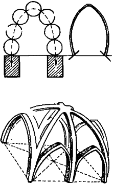 Слева рисунок из книги венецианского математика Джованни Полени. Шары не связаны раствором, но в результате расположения по дуге они сохраняют равновесие. Справа профиль сосуда неолитического времени со стоянки Муллино на Урале (VI тыс. до н. э.) в перевернутом виде. (Лепка сосудов начиналась от венчика ко диу). Внизу каркас крепления свода в готическом храме (нервюры).