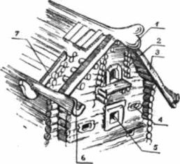 Схема наименований деталей конструкций русской избы, построенной без применения гвоздей: (1) охлупень, (2) слеги, (3) причелина, (4) волоковое окно, (5) красное окно, (6) водоточник, (7) курица.