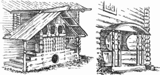 Высокий подклет северной избы породил разнообразные типы крылец. Простейший из них состоит из лестницы и верхней площади – рундука. Сложное крыльцо имело два рундука. Крыльца были открытые и закрытые. Крыша поддерживалась колонками. Сбоку рундуки и всход ограждались перилами, которые нередко зашивали досками. В более позднее время перила делали из резных и точеных баляс. Крыша над верхним рундуком часто была двускатной. Встречаются крыльца с двумя симметрично расположенными входами, направленными в разные стороны от рундука. Интересной архитектурной деталью северных построек были галереи (выходы), опоясывающие дом на уровне перекрытий второго этажа. Сбоку галереи ограждались перилами, навесом над ними часто служило продолжение ската крыши, поддерживаемое колонками. Позднее такие галереи – гульбища – устраивались и в дворцовых постройках и в церквах.