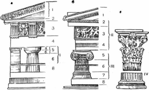 Архитектурные ордера античности: а) дорический, б) ионический, в) коринфский.