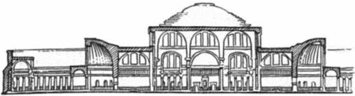 Базилика (в переводе с древнегреческого – царский дом) в античные времена представляла собой общественное здание, где производился суд, велись торговые сделки и т. п. По типу базилик в IV—VI вв. строятся и первые христианские церкви в Византии. Они имели вытянутую прямоугольную форму, разделенную на три или пять продольных нефов[87]87