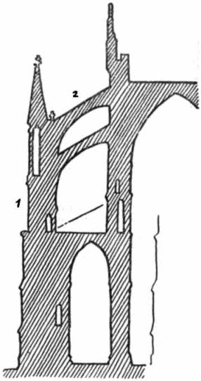 Схема конструкции готического храма: контрофосы (1), аркбутаны (2).