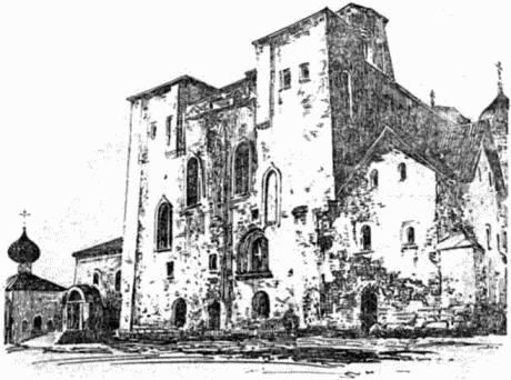 [Закрыть], другие склонны иначе видеть его завершение. Преображенский собор сейчас более напоминает готический собор, чем православную церковь. Уходящие ввысь на 40 м стены (толщиной до 5 м), без горизонтального членения (что не типично для русских храмов того времени); две башни напоминающие беффруа собора Парижской богоматери, боковые лопатки, похожие на контрфорсы готических соборов, и многие его особенности удивляют. Скорее это мощная крепость в крепости, чем храм для молений. Выделяется он и симметричным расположением приделов. Исследователи сопоставляют Преображенский собор только с тремя выдающимися строениями того времени – соборами Василия Блаженного в Москве, Бориса и Глеба в Старице и Иоанна Предтечи в Дьякове. Самым монументальным и необычным из них является Преображенский собор.