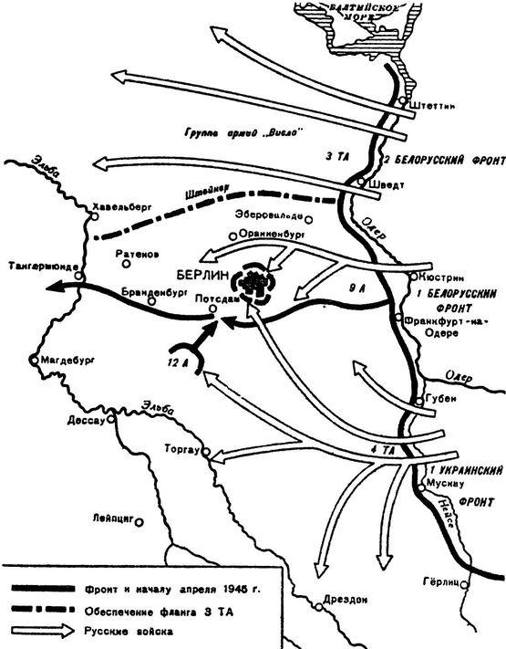 Еще раз ему и его министру пропаганды удалось при помощи лживых обещаний погнать в бой тысячи людей, вселив в них надежды, которым не суждено было сбыться. Остатки 9-й армии вместе с находившимися в Берлине охранными частями, сводными подразделениями военных ведомств и штабов, отрядами фольксштурма, солдатами зенитных частей ПВО города и вооруженными наспех отрядами «гитлеровской молодежи» были брошены навстречу надвигавшейся лавине закаленных в боях русских войск. С яростью и ожесточением дрались они в этом страшном последнем бою, защищая свой собственный дом. Берлин – этот последний оплот в борьбе против стремительно наступавшего с востока противника – сопротивлялся отчаянно. Его защитники не теряли надежд на то, что немецкие армии, шедшие к ним на помощь, а может быть, и западные союзники – в случае, если эти армии окажутся разгромленными, – скоро войдут в город и спасут его от кровавого разгула большевиков. Но эти надежды оказались напрасными: войска, пытавшиеся прорвать кольцо окружения извне, уже не в состоянии были достичь города. Вместе с тем западные союзники пока еще не могли изменить свою политику в том направлении, в каком она стала развиваться в последующие годы. Они не видели никаких оснований для того, чтобы оспаривать у своего союзника право на завоеванную им добычу.