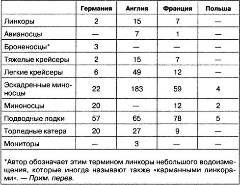 К приводимым выше цифровым данным о боевом составе Военно-морских сил следует добавить, что водоизмещение некоторых английских кораблей было больше водоизмещения соответствующих немецких кораблей. Тем самым англичанам с самого начала было обеспечено преимущество в огневой мощи, толщине броневого покрытия и скорости хода.