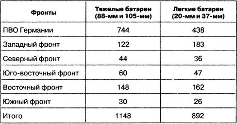 Для переброски на Восток из системы ПВО оккупированных областей Западной Европы было выделено также 99 тяжелых и 147 легких зенитных батарей. Это мероприятие в значительной мере уменьшило значение того предполья, о котором мы уже говорили выше. Ослабление ПВО предполья серьезно ослабило и всю противовоздушную оборону страны. Правда, в оккупированные на Западе районы были передислоцированы находившиеся ранее в Германии запасные зенитно-артиллерийские дивизионы. Однако их фактическая боевая ценность была весьма невелика, так как их личный состав не имел достаточной боевой подготовки. Боевое использование этих подразделений осложнялось еще и тем, что физическое состояние личного состава батарей, укомплектованных солдатами пожилого возраста, не позволяло выполнять одновременно две задачи – обучаться и принимать активное участие в отражении воздушных налетов противника.
