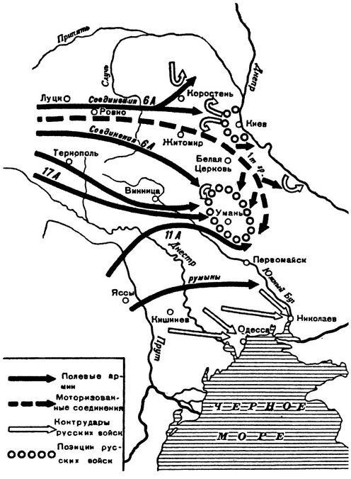 Борьба на рубеже Днепр – Западная Двина. Окружение войск противника в районе УманиВ соответствии с директивой по проведению операций группа армий «Юг» 5 июля вновь перешла в наступление с рубежа: река Прут, среднее течение рек Днестр, Збруч и Случь. Войска имели задачу быстро выйти своим левым крылом к Киеву, повернуть затем на юго-восток, перерезать пути отхода войскам противника, действовавшим перед фронтом 17-й и 6-й армий, а также румынских соединений, и не дать им уйти на восток за Днепр.