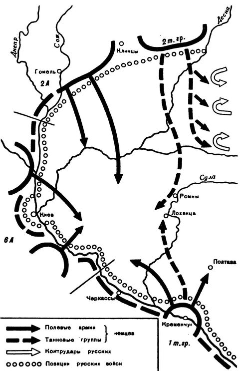 После того как 22 августа был отдан приказ об уничтожении группировки противника в районе Киева, группа армий «Юг», преодолевая незначительное сопротивление русских, вышла своим правым крылом к Днепру на участке от устья реки до Кременчуга. Левее на участке между Кременчугом и Черкассами действовали 17-я армия и 1-я танковая группа. С севера к ним примыкала 6-я армия, охватывавшая плацдарм русских в районе Киева. Своим левым флангом она установила связь со 2-й армией группы армий «Центр», которая удерживала выступавшую на восток линию фронта до Новозыбкова, где к ней примыкала 2-я танковая группа. Левый фланг 2-й танковой группы упирался в Десну. В излучине Днепра находились крупные силы противника, которые очень упорно обороняли плацдарм в районе Киева. Таким образом, сложились весьма благоприятные условия для окружения киевской группировки противника ударом на север из района Кременчуга и ударом на юг с рубежа Новозыбков – Десна, то есть на фронте 2-й танковой группы.