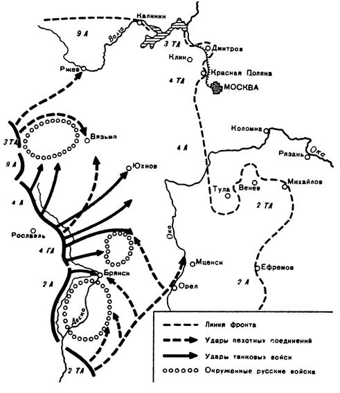 2 октября при мощной авиационной поддержке совершенно неожиданно для противника в наступление перешли основные силы группы армий. 2-я и 4-я армии, нанося главный удар своими смежными флангами, осуществили во взаимодействии с войсками 4-й танковой армии глубокий прорыв обороны противника в районе севернее и южнее Рославля. Затем 2-я армия повернула свои силы на юго-восток, а 4-я армия – на северо-восток, чтобы создать предпосылки для окружения двух крупных группировок противника на юге в районе Брянска и на севере в районе Вязьмы. К 14 октября войскам 2-й и 4-й армий удалось соединиться с вышедшими в тыл противнику частями 2-й танковой армии и окружить две большие группировки русских севернее и южнее Брянска. Лишь незначительным группам противника удалось прорвать слабый фронт окружения и уйти на восток. Оставшиеся в «котле» силы противника капитулировали к 20 октября.