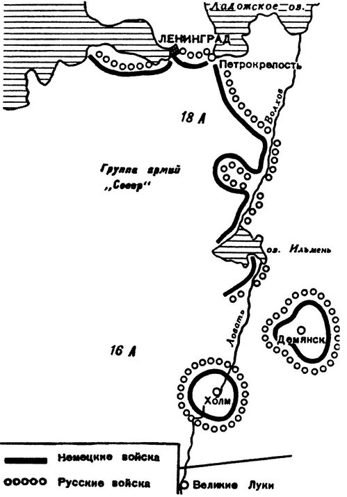 Значительно более сложная обстановка сложилась в районе южнее озера Ильмень. Русские войска прорвали оборону немцев к югу от Старой Руссы, повернули на юг и, продвигаясь вдоль реки Ловать, соединились с войсками, наступавшими из района Холм в северном направлении. В результате этого 8 февраля 1942 года немецкие войска, оборонявшиеся в районе Демянска и Валдайской возвышенности, были окружены. Однако взять обратно Старую Руссу противнику не удалось. В этом ставшем вскоре «знаменитым» Демянском «котле» находились шесть немецких отборных соединений 2-го и 10-го армейских корпусов общей численностью до 100 тыс. человек. Несмотря на недостаточное снабжение, производившееся исключительно по воздуху, и обусловленную этим частую нехватку продуктов питания и боеприпасов, окруженные немецкие войска, страдая от сильных морозов и отбивая непрерывные атаки русских, сумели удержать свои позиции. В конце апреля в результате удара извне немцам удалось деблокировать окруженную здесь группировку. Подобным же образом в течение нескольких месяцев, успешно отражая все атаки русских, держалась и немецкая группировка, окруженная в районе Холм.