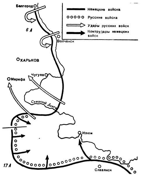12 мая, в самый разгар подготовки немцев к наступлению, когда на юге еще полным ходом шли бои за Керченский полуостров, войска русского маршала Тимошенко внезапно перешли в наступление. Оно имело далеко идущие цели и должно было привести русских к овладению Харьковом. Войска Тимошенко начали наступление с выступа фронта западнее Изюма и севернее него на участке между Белгородом и Волчанском. Войска северной ударной группировки глубоко вклинились в оборону немцев, но скоро были остановлены силами, сосредоточенными здесь в ожидании летнего наступления. На юге противнику также удалось прорвать оборону немецких войск. Здесь очень часто обстановка принимала весьма критический характер, заставляя самого Гитлера вмешиваться в руководство войсками. После тяжелых боев противник был наконец остановлен на рубеже Чугуев – Мерефа. Поэтому немецкое командование, имевшее достаточные силы, развернутые для ведения летнего наступления, не могло не воспользоваться столь благоприятным моментом.