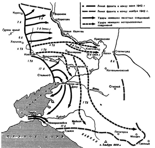 Немецкое Верховное главнокомандование, к сожалению, не разобралось в новой тактике противника. Вероятно, находясь под влиянием чересчур оптимистичных докладов, которые поступали от штабов наступавших соединений, и видя, как быстро продвигаются вперед немецкие войска, оно полагало, что противник полностью деморализован и, по-видимому, не может продолжать борьбу. Гитлер опасался, что, бросив свои основные силы на Сталинград, он нанесет удар по пустому месту и будет терять зря драгоценное летнее время. Он считал, что для выполнения этой задачи хватит и гораздо меньших сил, чем предусматривалось планом, и что можно параллельно с достижением первой цели достигнуть и второй, более важной для него цели, то есть овладеть нефтяными районами Кавказа. Такая оценка обстановки была абсолютно неправильной; она привела к серьезнейшим ошибкам – к тому, что наступавшая группировка оказалась поставленной перед двумя совершенно различными целями.