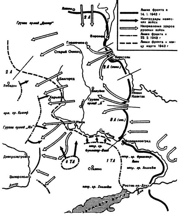 В результате отхода немецких войск с Волги и Кавказа все районы, захваченные в период летне-осеннего наступления, были почти полностью отданы противнику. При этом немецкие войска потеряли много сил, так и не добившись серьезного ослабления боевой мощи русских. Все надежды на вовлечение стран Среднего Востока в борьбу против Англии и на захват нефтяных месторождений Кавказа, которые должны были способствовать росту немецкой авиации и моторизации, немцам пришлось оставить. Вместе с тем наступательные возможности русских все еще не были исчерпаны. Район между Северским Донцом и Воронежем стал ареной нового удара русских. Жертвой этого удара явились в первую очередь 2-я венгерская и 2-я немецкая армии, причем последняя была чрезвычайно ослаблена в результате передачи части сил на Южный фронт. В тылу венгерской армии, имевшей в своем составе 10 дивизий, находился в резерве один немецкий корпус из двух дивизий.