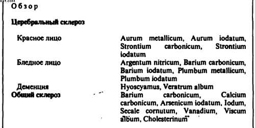 Индивидуальная симптоматика сильно перекрывается преимущественно общими симптомами основного заболевания, поэтому выбор лекарств часто ограничивается средствами, которые имеют четкое органотропное отношение к сосудистой системе при склерозе. Если же Вы по клиническому синдрому не сможете подобрать подходящего лекарства, то я советую провести реперторизацию по тщательному изучению истории болезни и выделению, оценке и ранжированию симптомов (см. «Реперторизация»), Само по себе пренебрежение советом о регулировании образа жизни и питания (диетой в широком смысле) является почти оскорблением медицинских традиций, однако в наше время это случается нередко из-за блаженной веры в действие новейших фармацевтических препаратов.