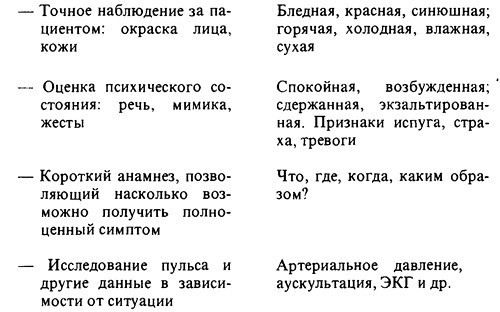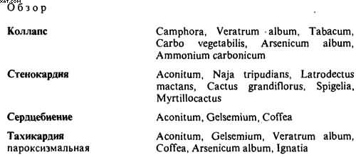 Этиологию часто выявить не удается, поэтому мы должны опираться на наблюдаемые феномены: пациент холодный, бледный, резкая слабость или обморок; на лбу часто холодный пот, лицо испуганное, черты заострившиеся. В этой ситуации вначале следует подумать о камфоре или Veratrum album, при сильной тошноте и головокружении о Tabacum. Выраженный цианоз напоминает нам о Carbo vegetabilis; сильный страх, слабость и беспокойство – об Arsenicum album. Мускулистым пациентам часто показан Ammonium carbonicum.