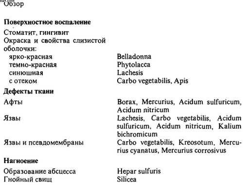 Lachesis*. Пурпурно-красная окраска вплоть до цианоза является признаком воспаления со стазом в капиллярах и распадом элементов крови, что ведет к изъязвлению. Боль в полости рта усиливается от теплого питья и пищи. Холодная пища, особенно лед, уменьшает болевые ощущения. Общее состояние резко нарушено, иногда бывает септическое течение, которое проявляется страхом, беспокойством и учащением пульса. Показан при стоматите, язвенном стоматите, угрожающем септическом состоянии. Применение: С6 (Д12), С30 (Д30) в растворе или инъекциях (внутривенно, внутримышечно).