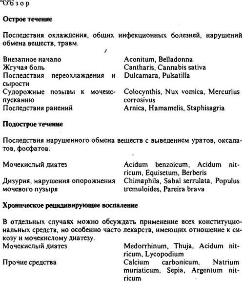 Belladonna. Острое начало с лихорадкой, жаром и потливостью. Последствия охлаждения в связи со сменой тепла холодом. Покраснение лица с пульсацией сосудов; широкие зрачки, обильный пот на теле с холодными конечностями; раскрываться не хочет, потому что зябнет. Жгучая боль в области шейки пузыря. Тенезмы мочевого пузыря. Иногда задержка мочи или обильный диурез. Область мочевого пузыря болезненна при пальпации и при сотрясении тела. Применение: С6(Д12) – С30 в растворе по методу I.
