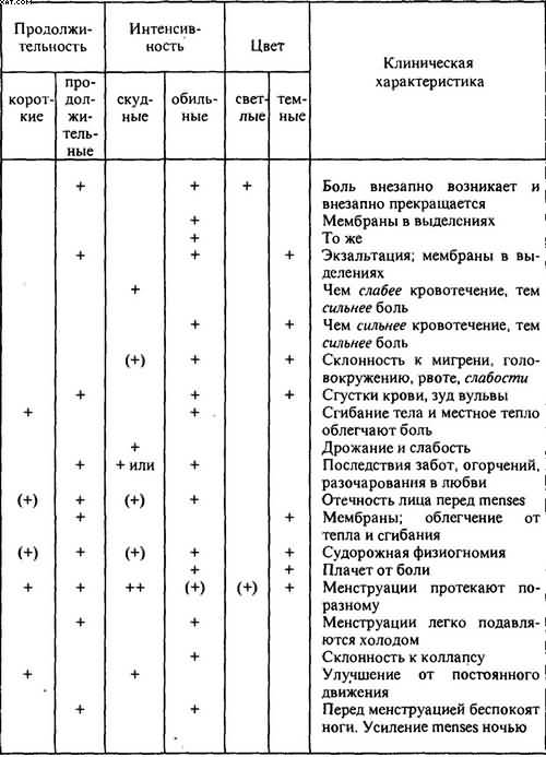 Psorinum*. Зябкие женщины; даже летом они одеваются тепло и испытывают страх перед малейшим сквозняком. Колющая, режущая боль в нижнем отделе живота во время менструации. Менструации короткие, скудные, прерывающиеся на несколько часов. Менструальная кровь имеет отвратительный запах. Цикл очень короткий. Обильные зловонные бели. Молочные железы напряжены и болезненны. Применение: С30, С200 в растворе.
