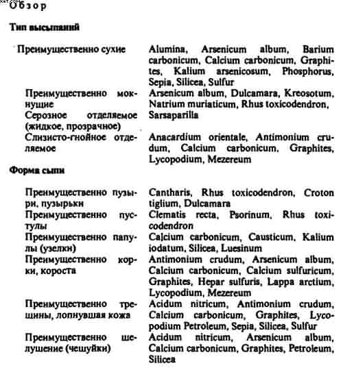 Рекомендации для поиска медикаментов. При гомеопатическом феноменологическом выборе лекарств мы ориентируемся на морфологию кожи и совокупность прочих симптомов. Классификация по диагнозу приобретает значение лишь тогда, когда она информирует о природе или патогенезе нарушения (например, чесотка, сибирская язва, микоз), поэтому для выбора лекарств важно знать:
