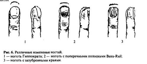 Некоторые признаки внутренних болезней наблюдали и описывали старые врачи: при застое крови в малом круге кровообращения ногти становятся голубоватыми. Если застой сохраняется длительное время, ногти выглядят округлыми, выпуклыми – ногти Гиппократа (рис. 6).