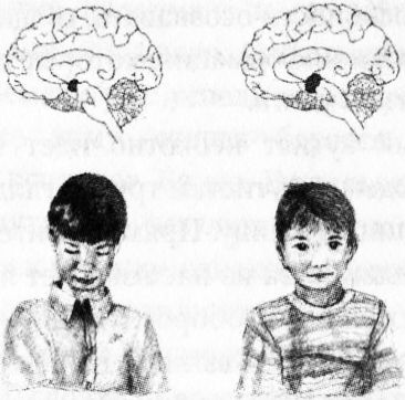 Типичный аутист неохотно идет на контакт с другими людьми. Аутистам трудно глядеть в глаза и общаться лицом к лицу. Прямой зрительный контакт для большинства из нас означает либо сигнал к сближению, либо, наоборот, угрозу – а аутисту сложно вынести чужой взгляд, что бы этот взгляд ни значил. Нейрофизиологи из Университета Висконсина при помощи МРТ исследовали у аутистов состояние миндалевидного тела – области мозга, состоящего из двух частей, миндалин, расположенных в глубине мозга. Миндалевидное тело обычно включается в ситуации опасности [135]. Оказалось, что у детей-аутистов миндалины меньше нормы и, чем они меньше, тем сильней выражено нежелание ребенка смотреть другим в глаза.