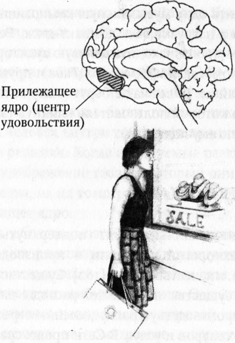 Будь вы охотник за скидками или, наоборот, любитель сорить деньгами, решение «купить – не купить» вам помогает принять особая структура в мозгу – прилежащее ядро. Доктор Брайан Кнутсон с коллегами из Стэнфордского университета [161] научился предсказывать по паттернам активности мозга (которые фиксировал МР-томограф), сделает ли подопытный ту или иную покупку. Что интересно, прогнозы были готовы даже раньше, чем сам человек внутри томографа принимал сознательное решение. Когда испытуемые разглядывали в Сети изображение товара, который они не прочь приобрести, на их томограмме вспыхивало именно прилежащее ядро.
