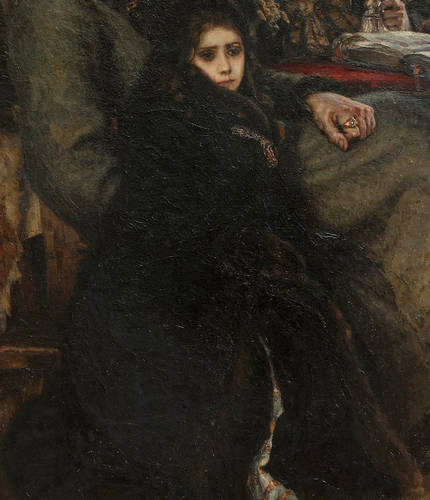 Впереди – печальная бледная девушка в черной шубке. Она бессильно прижалась к отцу, и ее пирамидальный силуэт не столько поддерживает движение кверху, сколько заставляет его оседать: так вяло падают на пол широкие полы шубы.