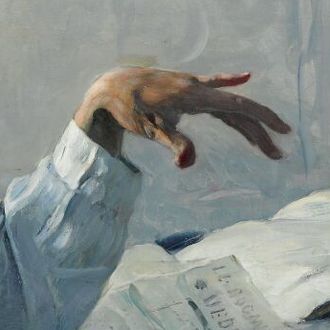 Резкий ракурс,[13] в котором фигуры показаны сверху и сбоку в картине Иогансона «Допрос коммунистов», немало способствует передаче драматического напряжения момента.