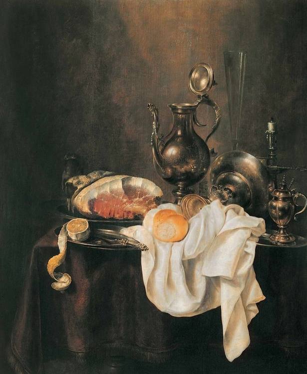 В. Хеда. Натюрморт. Ветчина и серебряная посуда. Масло. 1649 г. Москва, Государственный музей изобразительных искусств.