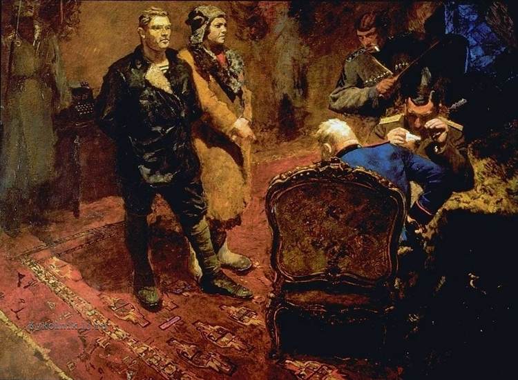 В «Допросе коммунистов» Иогансона мы не только видим трагическую сцену времен гражданской войны, но нам раскрывается героическая доблесть коммунистов и преступная низость белогвардейцев. Картина заставляет нас почувствовать, что хотя коммунисты, приведенные на допрос, наверное, погибнут, – дело их правое, и оно неизбежно победит: так много уверенной силы в фигурах пленных, так жалки в своей смятенной злобе белогвардейские офицеры.