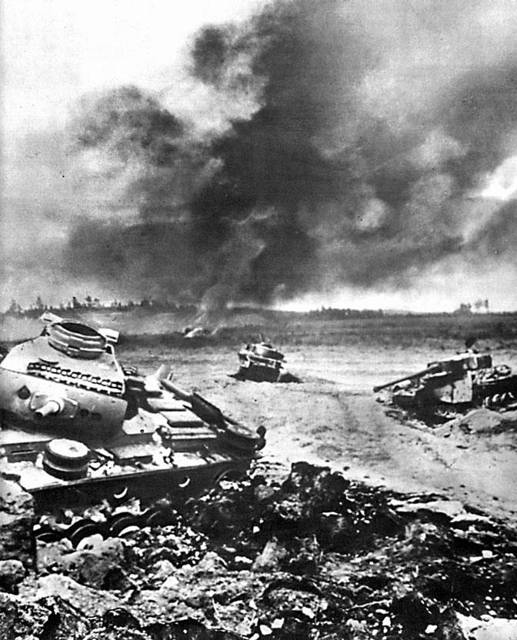 Германские Pz-IV, попавшие под огонь советских противотанковых пушек. В 1943 году ПТО уже была отлажена, стрелковые подразделения были насыщены соответствующими средствами, потому блицкрига на «Курской дуге» у панцерваффе не вышло. И в дальнейшем никаких прорывов – немцы были еще способны нанести короткие и достаточно сильные удары, но не больше. И «тигры» с «пантерами» тут не могли помочь…